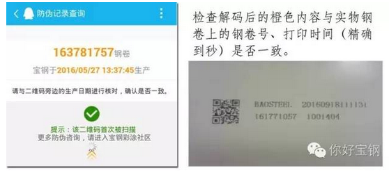 寶鋼系統(tǒng)采用雙碼關(guān)聯(lián)合一技術(shù),根據(jù)卷號(hào)、線號(hào)、時(shí)間、序列等條件生成唯一加密二維碼,用戶只需使用智能手機(jī)掃碼即可與彩涂卷上明文噴印的卷號(hào)、時(shí)間比對(duì)驗(yàn)證產(chǎn)品真?zhèn)巍?