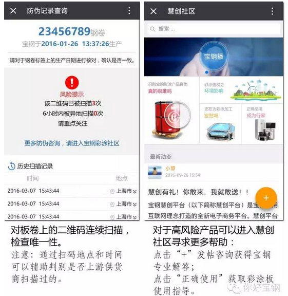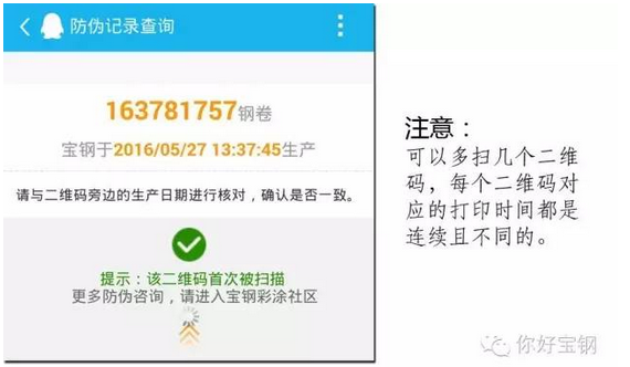 同時(shí),寶鋼系統(tǒng)將記錄每一次掃碼的時(shí)間和地點(diǎn),并在用戶掃碼時(shí)展示該二維碼的掃描記錄,從而幫助用戶判別產(chǎn)品真?zhèn)巍?